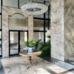 Pisos de mármol travertine en areas sociales.