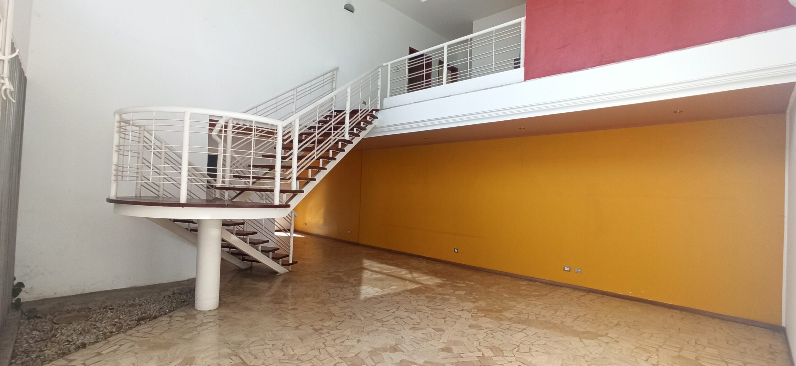 Amplia sala con escalera de caracol en una estructura de metal