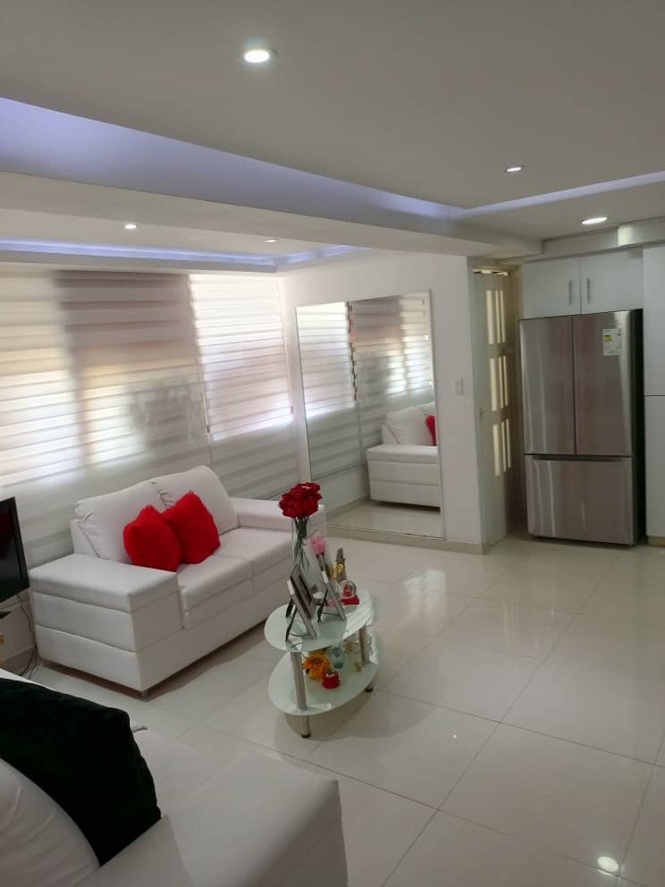 vende apartamento remodelado semi amoblado, listo para ser habitado, de 64 mts, Sala, comedor y cocina integrados en un solo ambiente, 2 amplias habs. con closets y aire acondicionados en cada una, 2 baños, uno de ellos dentro de la habitación principal, área de lavandería, dos tanques de 1050 litros con bomba y sistema hidroneumático, 1 puesto de estacionamiento en área común. Piso Alto.