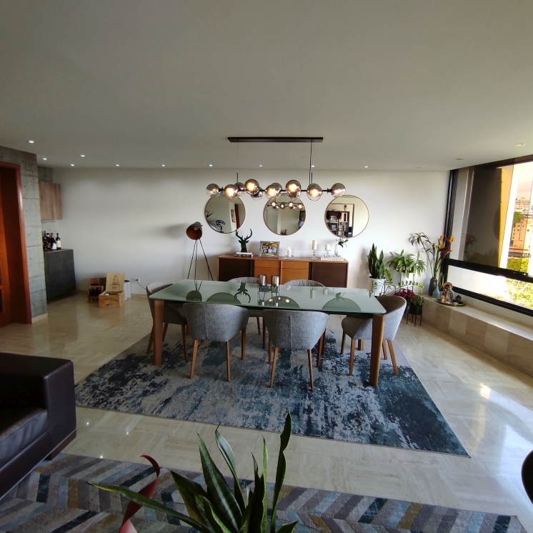 Area Social: Amplio e iluminado espacio abierto con Comedor, Salón principal y otro Salón TV, con ventanal corrido con vista panorámica hacia el Norte. Baño de visita. Pisos de mármol y acabados especiales en paredes.